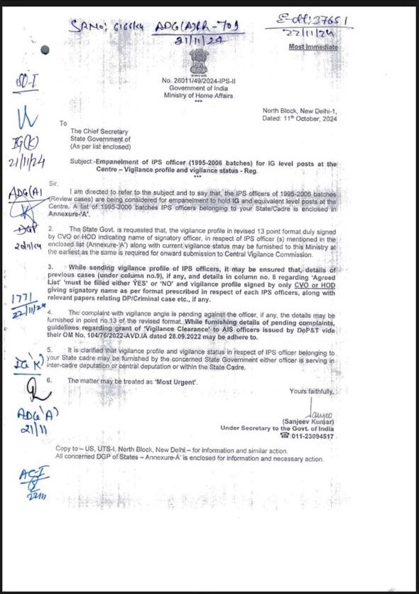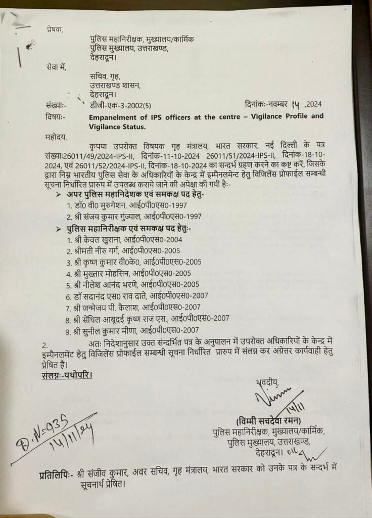 11 अक्टूबर 2024 को केंद्रीय गृह मंत्रालय ने उत्तराखंड शासन को चिट्ठी भेजी कि आईपीएस के विभिन्न पदों पर इंपैनलमेंट की प्रक्रिया गतिमान है, इसलिए 2006 बैच तक के अधिकारियों की विजिलेंस क्लीयरेंस भेजे। और इस समय 2006 बैच के आईपीएस को IG रैंक में इंपैनल करने की प्रक्रिया भी चल रही है।