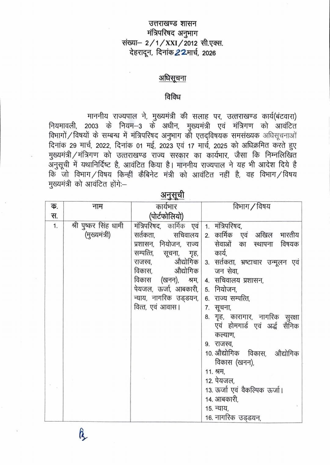 कुल मिलाकर, यह विभागीय बंटवारा सरकार की कार्यशैली को अधिक समन्वित, जवाबदेह और परिणामोन्मुख बनाने की दिशा में एक महत्वपूर्ण कदम माना जा रहा है।