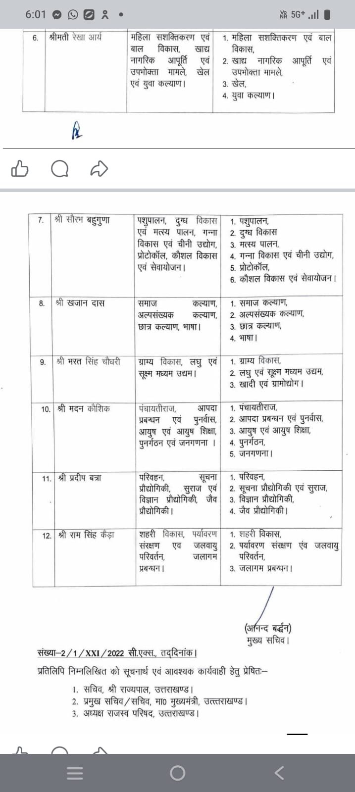 वहीं, अन्य विभागों का बंटवारा मंत्रियों के बीच करते हुए उन्हें उनके-उनके दायित्व सौंपे गए हैं, ताकि विभागीय कार्यों का प्रभावी क्रियान्वयन सुनिश्चित हो सके। सूत्रों के अनुसार इस नए बंटवारे से कार्यों में बेहतर समन्वय स्थापित होगा और विकास योजनाओं को तेजी से धरातल पर उतारा जा सकेगा।